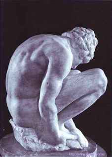 大英博物馆陈列着米开朗基罗的一件小泥塑稿,约莫5cm,可是那肌肉、骨骼及腕关节、膝关节的准确与肯定所呈现出的悲剧力量在娴熟的手法——每块指压、指推、指捏的运动中,在体积、结构、节奏的模糊中却清楚的凸现出来。这种泥稿的背、腿及扭曲的上身使人们油然与那惊世的《奴隶》相联系。我想,无论是谁看到这件小稿时,都会在米开朗基罗那忧郁、沉厚的深处发现生命不挣,以及从生命底的核心中发出的与生俱来的痛苦。