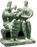 对于《家庭群像》这一主题,自1944年第一个泥塑稿起,亨利·摩尔共创作了约17件作品,这里选用的是他最得意的一个。作品中,母亲双手环绕着孩子的腰部,父亲托着孩子的双腿,他们的头部自然地转向自己心爱的儿子,给人慈祥与爱怜的感觉;孩子在父母的环抱中,显得活泼却又安详;整个作品充满了一种宁静而温馨的情调,使人沉浸在天伦之乐的氛围中。 在人物空间关系的艺术处理上,亨利·摩尔有意识地把孩子处理在父母双手的环抱之间,使孩子横卧的臀部刚好坐在母亲的膝盖上,形成有机的连接,同时三个形象又相对独立,互不阻挡。这样的处理,即表示了家庭成员间独立的人格,又巧妙地告诉公众,孩子是联系父母的重要纽带。 通过家庭和人物主题的创作,亨利·摩尔充分地显示了对母爱和人伦幸福的关注,表现了他作为一个人道主义者对社会生活和家庭生活的理想。