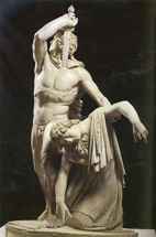 希腊化时期重要的艺术中心之一在小亚细亚柏加马王国。在公元前241—197年间击退了高卢人的猛烈进攻,为此,柏加马王国建立了卫城,并在广场上建立了胜利纪念碑性雕塑群像。《自杀的高卢人》是其中的作品作品表现被打败的高卢人首领,为了不作敌方阶下囚而受辱,勇敢而坚定地杀死爱妻之后自杀。这是一座震撼人心的悲剧性雕像。雕刻家着意刻画自杀时的紧张瞬间,群雕采用各种对比的手法塑造形象,立与垂下、生与死、动与静、形体的仰与俯、正与侧转,构成了一座三度空间四面观赏的组合雕塑形式,成为后来广场雕塑像的范本。