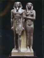 闪绿色粘板岩雕刻,高约142 厘米,约创作于公元前2600年,现收藏于美国波士顿博物馆。这是埃及古王国第四王朝时期的一尊双人立像,也是当时帝王立像中最典型的代表。雕像刻划的是埃及古王国第四王朝第五个法老门考拉和他的王妃。