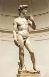 云石雕像,像高2.5米,连基座高5.5米,米开朗基罗创作于公元1501-1504年,现收藏于佛罗伦萨美术学院。这尊雕像被认为是西方美术史上最值得夸耀的男性人体雕像之一。不仅如此,《大卫》是文艺复兴人文主义思想的具体体现,它对人体的赞美,表面上看是对古希腊艺术的“复兴”,实质上表示着人们已从黑暗的中世纪桎梏中解脱出来,充分认识到了人在改造世界中的巨大力量。米开朗基罗在雕刻过程中注入了巨大的热情,塑造出来的不仅仅是一尊雕像,而是思想解放运动在艺术上得到表达的象征。作为一个时代雕塑艺术作品的最高境界,《大卫》将永远在艺术史中放射着不尽的光辉。