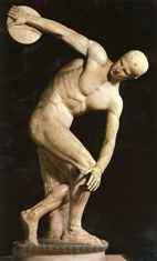 高约152 厘米,罗马国立博物馆、梵蒂冈博物馆、特尔梅博物馆均有收藏,原作为青铜,米隆作于约公元前450 年。原作已佚,现为复制品。雕像选取运动员投掷铁饼过程中的瞬间动作,这正是铁饼出手前一系列瞬间万变动作中的暂时恒定状态,运动员右手握铁饼摆到最高点,全身重心落在右脚上,左脚趾反贴地面,膝部弯曲成钝角,整个形体有产生一种紧张的爆发力和弹力的感觉。形体造型是紧张的,然而在整体结构处理上,以及头部的表情上,却给人以沉着平稳的印象,这正是古典主义风格所追求的。