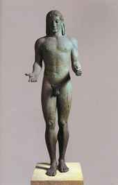 希腊早期雕像有模仿埃及雕刻造型的痕迹,古风时期尚残存,但雕刻家已开始不满足于模仿,力求用自己的眼光探索人体结构和人体比例,创作出写实、自然、富有生气的艺术形象来。古风时期的男子雕像大多是墓前雕刻品,有的是死者本人,有的为死者而立,一般称之为阿波罗像,这是因为古希腊神人同形同性所致。青年男子立像为裸体,多取站立姿势。这尊被称为阿波罗的青年立像仍存有埃及造型程式,但他低头和手势姿式已趋生活化,他向下视,两臂向前伸,似有接物之意,看得出人物形态已从直立僵化向生活化活动迈前一步。
