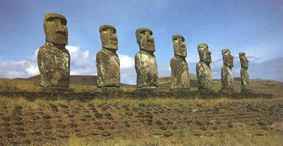 石雕,高4-5米,最高的高9.8米,约公元600-1680年。复活节岛是南太平洋上一个孤立的小岛,因考古学家是在1年的复活节发现它的,故而得名。这些雕像都是用整块石头雕刻而成,一般高4-5米,重约20吨,最高的达9.8米,重达90 吨。