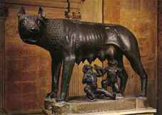 青铜,高85厘米,约创作于公元前500年,现收藏于意大利罗马市政博物馆。雕像取材于罗马建城的传说:著名的特洛伊战争结束后,特洛伊王子逃到意大利半岛,建立了阿尔巴城,世代相传;后来,一个名叫努米托耳的国王被其弟阿木留斯推翻,儿子被杀,但他的女儿为战神所爱,生下一对双胞胎罗穆路和瑞穆斯,却被阿木留斯放入篮子中丢人台伯河;这对兄弟后来被一只母狼发现并收留抚养,不久,被牧人发现收养;他们长大以后,杀死仇人,救出外祖父,创建了新的城市;后来罗穆路杀死了瑞穆斯,并以自己的名字命名这座城市为罗马。这尊雕像所刻划的就是曾经哺育了罗马创始人的母狼的形象。这尊雕像是埃特鲁斯坎人的艺术杰作,对罗马人来说,它还具有纪念碑意义,人们把它作为民族发源的始祖而给以顶礼膜拜。现在,雕像《母狼》已成为了罗马市的象征。