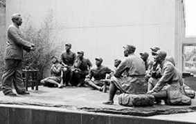 在教学区的空地处、墙壁上、草坪间、树林旁,蓦然出现的一座座雕塑作品,总是让人眼前一亮、激动不已:《孙武著书》、《精忠报国》、《毛泽东抗大讲学》、《狼牙山五壮士》、《转战于白山黑水的抗日勇士》、《虎门销烟》、《两弹元勋》、《航天英雄》、《跨越》、《长征》……无论是青铜的还是花岗岩的,无论是浮雕还是座雕,在它们起伏的材质表面和坚实的体块深处,都蕴涵着一种内在的生命力量。这种力量会在瞬间直逼肺腑,对人的心灵进行潜移默化的浸润。