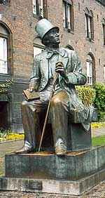 市政厅建筑物旁边面对着蒂沃里(Tivoli)公园的角落,坐着一位穿西装长袍和戴着高帽的男士塑像,他就是大名鼎鼎、名字与丹麦分不开的童话作家安徒生(Hans Chistina Andersen)了。   安徒生于1805年出生在丹麦奥斯丹,一生写过《美人鱼》、《卖火柴的女孩》、《丑小鸭》等150篇不朽童话故事,为世界上千万儿童编织了美丽的童年。   这尊以铜打造、约3米高的安徒生塑像,座落在人潮熙攘的大街旁,每天都有不少游客经过他身边,认识他的会抬起头瞻仰大师的面容,或者把手按在他的膝盖头拍照留念。