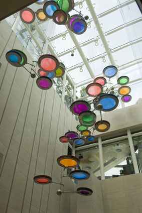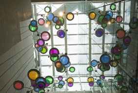 拉尔方索对光的运用具有非常鲜明的特色,《五彩精灵》是由160个圆盘组成,丰富多彩的半透明圆镜漂浮在空中,相互交错运动,在空间中形成五彩缤纷的投影。作品采用悬挂式设计,形状随着作品的移动不断变化,在天花、地面、墙壁上产生许多迷人的影像,无论是孩子还是成人,都能获得非常愉悦的视觉享受。(见五彩精灵附图)