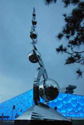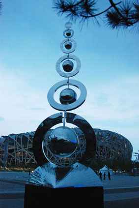 借着北京举办奥运会的机会,拉尔方索来到了中国,为奥运献礼,希望对中国的动态艺术发展有所启迪。由他亲自创作的作品《风中之舞》,坐落在国家体育场“鸟巢”和国家游泳中心“水立方”之间的树阵旁边,人们会看到一件制作精美的不锈钢雕塑作品,它由七个球体和七个圆环构成,象征一种和平和自然的人文情怀。时而,人们会发现它会在风力的帮助下呈现出一种非常优美的波浪形摆动——天光摇曳,云影娉婷,风中柳岸,长袖汉姬!(见风中之舞图)