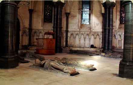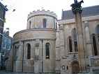 圣殿教堂在舰队街和泰悟士河之间,舰队街最出名的是它一度是英国报业的聚集地。圣殿教堂是12世纪的建筑,当时是英国圣殿骑士的总部。提宾爵士说里面是异教邪端到极点,其实应该不是。这座教堂是以耶路撒冷的圣墓教堂为原形建造的,最奇特的是内厅里地上的骑士浮雕。教堂多有名人埋葬于中,在著名教堂四壁都会有名人墓及墓铭志。例如罗马的万神殿有拉菲尔的墓,佛罗伦萨的圣十字教堂是米凯朗基罗的最后安息地,可是圣殿教堂不同的是它的墓在地下,而且每一个墓上都有栩栩如生的骑士像,的确与众不同。教堂和英国历史交错,1215年英国贵族与王室在教堂交涉而最后订立《大宪章》,教堂在十四世纪后成为王室家产,后来在莎士比亚的《亨利六世》中,圣殿教堂成为戏剧背景,在这儿的花园里摘下的红白玫瑰成为十五世纪玫瑰战争的起 始。红白玫瑰战争最后以红玫瑰兰开斯特家族亨利·都铎娶了白玫瑰约克家族的玛丽·约克公主而结束了英国王权争夺战,在西敏寺教堂的Chapter House雕有很多玫瑰和都铎王朝的两朵玫瑰徽章和这么一句话:玫瑰是花中之花,这里是屋中之屋(As the rose is the flower of the flowers, so this is the house of the house.),这里成了都铎家族的安葬地。